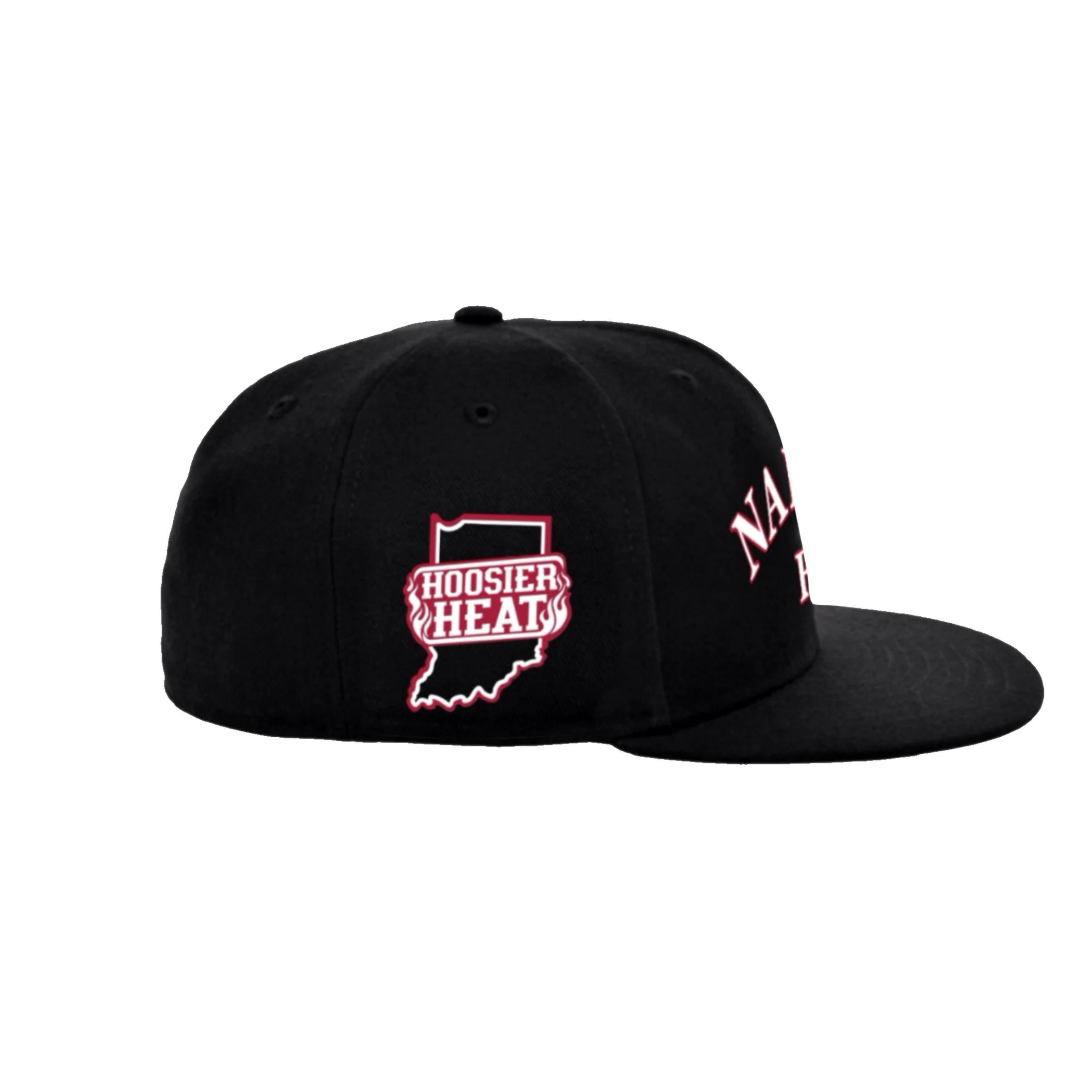 Embroidered Naptown Fire lettering in white with red outline across the front panels. Indiana state with “Hoosier Heat” logo on the right side panel honoring Indiana Hoosiers.